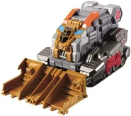 It has a carrier mode, in which it is a long vehicle with the scoop portion in back. It can hold one standard size Tomica. It is packaged with the Rescue Dash 2 Extra Model. When its parts are reconfigured, it can form he bulldozer shaped Dozer Dragon Rescue Mode. Here, the front portion opens and a Tomica can be stored inside and launched.
